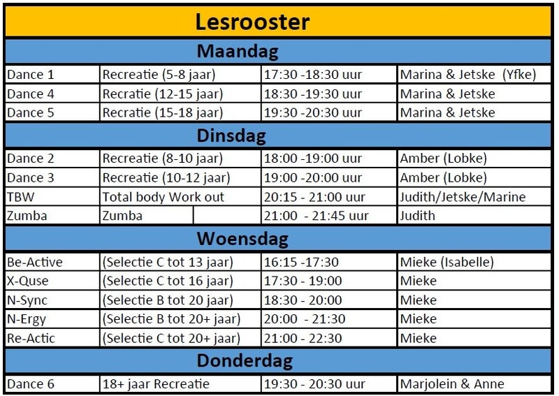 NIEUWE SELECTIEGROEP vanaf september!! Graag willen we - op de valreep van de zomervakantie - jullie nog even informeren over de start van een nieuwe selectiegroep en het daarmee veranderende lesrooster voor de woensdagavonden. Voorheen betekende 16 jaar worden dat je ging dansen in een van onze 20+ groepen. Die overgang is niet ideaal en zorgde voor soms wat grote leeftijdsverschillen. Nu er 7 meiden vanuit X-Quse gingen doorschuiven, leek het een ideale moment om dit op te lossen. Dit plan werd zo enthousiast ontvangen dat we gelijk door hebben willen en kunnen pakken. Graag onthullen we aan jullie de nieuwe naam van onze 16-20 jaar groep (die de dansers zelf bedacht hebben):In-Sync !!! Na overleg zijn we gekomen tot het volgende nieuwe rooster:16.15- 17.30 uur: BE-AcTive17.30 - 19.00 uur: X-Quse18.30 - 20.00 uur: In-Sync 20.00 - 21.30 uur: N-Ergy21.00 - 22.15/30 uur: Re-Act Behalve voor N-Ergy is het voor alle groepen mogelijk om woensdag 3 september te komen proefdraaien en daarna nog 3 proeflessen te draaien als de eerste les bevalt. Iedereen is welkom, lid of geen lid, met of zonder ervaring. Door de herindeling van de groepen zal Re-Act (voorlopig) een wat kleinere groep zijn. Met name voor deze groep zouden we nog wat dames 20+ (30+ is ook geen enkel probleem) kunnen gebruiken die willen aansluiten. Deel daarom vooral deze informatie in je omgeving! Voor vragen kun je altijd bij Mieke terecht.